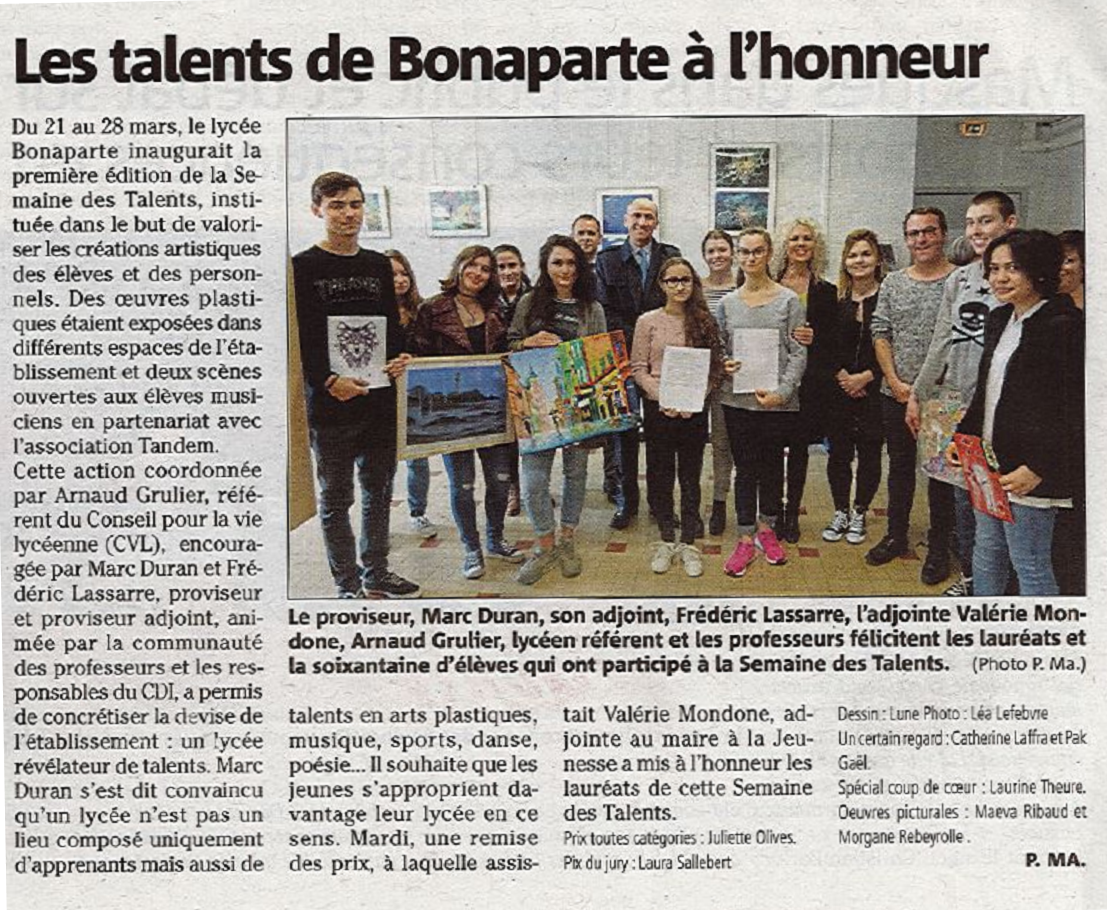 Mardi 27 mars, les lauréats de la Semaine des Talents ont été récompensés, en présence de l'équipe de direction du lycée, de Mme Mondone, adjointe au maire déléguée à la jeunesse, du référent vie lycéenne, et de professeurs. Une belle cérémonie, très bien décrite par Pascale Maes dans l'article paru dans le numéro du 28 mars de Var Matin.