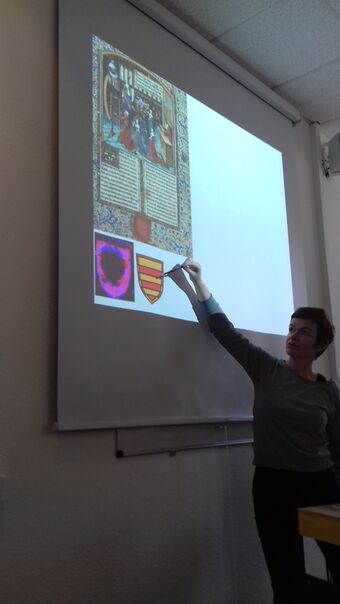 Florence Boulc'h montrant aux élèves le blason "caviardé" et la miniature du folio 6
