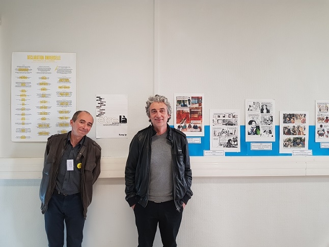 Ce jeudi 6 décembre, c'est pour son reportage graphique, Etre là, qu'il est accueilli au CDI du lycée Bonaparte. Toute la matinée, il échange avec les élèves autour de son oeuvre, accompagné de Pierre Mitrano, bénévole à Amnesty International antenne de Toulon.