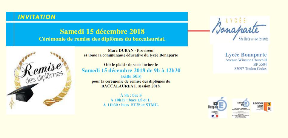 Les diplômés et leurs parents sont cordialement invités samedi 15 décembre 2018 aux horaires suivants :