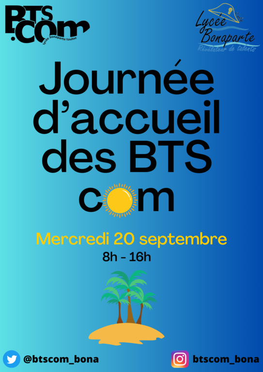 Le 20 Septembre se tiendra la journée d'accueil des classes de BTS communication ! Cela se déroulera de 8h à 16h avec différentes activités physiques et ludiques.