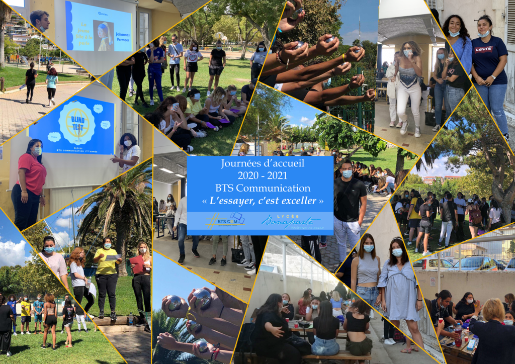 LES JOURNEES D'ACCUEIL DU BTS COMMUNICATION Vie du Lycée mercredi 23 septembre 2020 Article précédent Retour à la liste Article suivant 3 JOURNEES DE PARTAGE, DE COHESION ET DE BONNE HUMEUR POUR UNE RENTREE DYNAMIQUE EN BTS COMMUNICATION", DONT LA DEVISE EST "L'ESSAYER C'EST EXCELLER" : Résumé en images des 3 jours, Le dépliant de l'événement, La newsletter, Le parrainage, La vidéo.