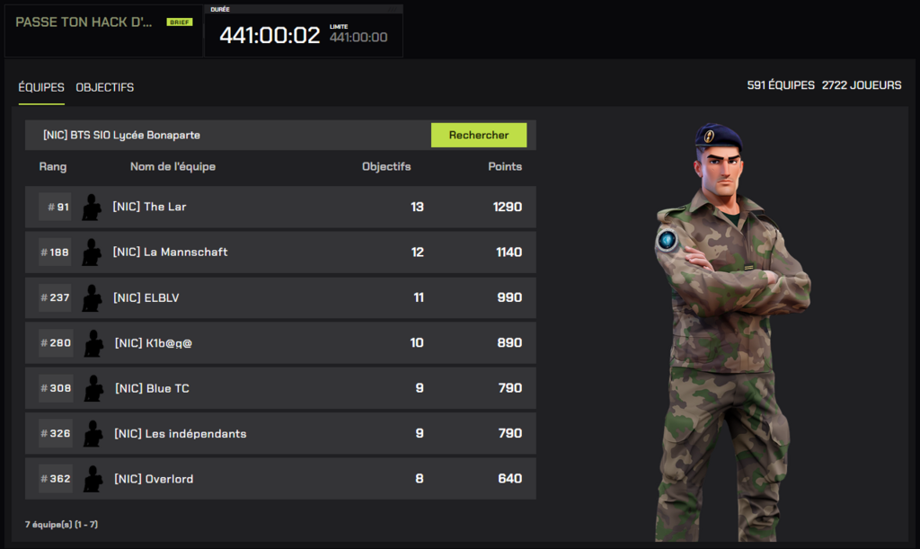 Parmi les 591 équipes engagées et les 2 722 participants, nos 7 équipes de première année en BTS SIO du lycée Bonaparte de Toulon ont obtenu un très bon classement : 91e, 188e, 236e, 237e, 280e, 308e et 362e places !