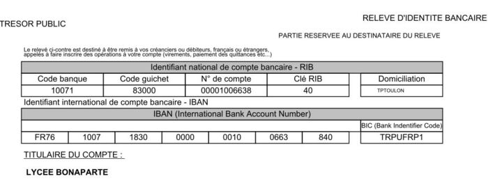 - Le versement est fait directement à l'établissement (voir RIB) qui vous fera ensuite un reçu justifiant de la somme et de la date de versement.