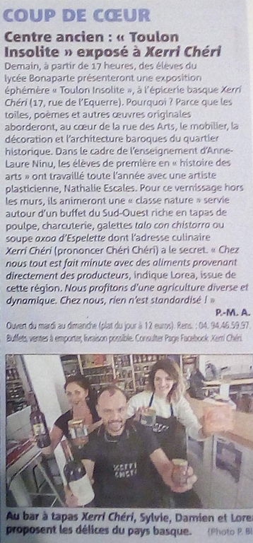 Le vendredi 18 mai, de 17h à 20h, le café Xerri Chéri accueille le vernissage "hors les murs" de l'exposition des œuvres réalisées par les élèves de première littéraire suivant l'option "Histoire des arts". Var Matin a annoncé l'évènement dans son numéro du 17 mai. L'article est signé P-M. A.