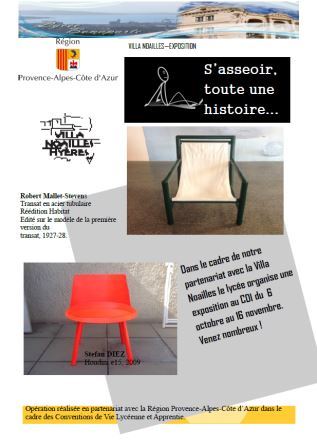 Dans le cadre du cours d’arts plastiques et du partenariat entre la Villa Noailles et le lycée, les élèves de 1ère de la section Histoire des arts seront amenés à créer un environnement plastique adapté à chacune des chaises présentées (architecture, peinture, sculpture, objets de décoration et de design).
