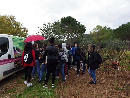 Le lundi 5 novembre dernier, dans le cadre de notre enseignement en biotechnologie, nous avons fait la visite du domaine viticole Peirecèdes à Cuers. Nous avons été accueillis par Véronique, la propriétaire et ses deux chiens. Nous nous sommes promenés à côté des vignes pour ramasser des feuilles des différentes cépages (variété de vigne) qui servent à faire des vins différents.