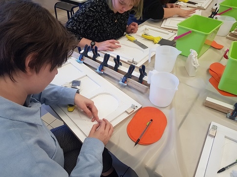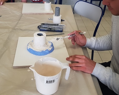 A mi-chemin de leur parcours, les élèves ont fait l’apprentissage de gestes et vocabulaire techniques. Ils ont découvert les gestes créateurs de la plâterie, quelques outils et produits nécessaires à la réalisation de l’objet.
