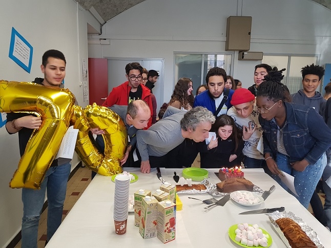 A l'issue de cet échange avec les élèves, l'Antenne Jeunes du lycée a proposé un petit goûter pour célébrer les 70 ans de la DUDH (Déclaration Universelle des Droits de l'Homme) rédigée en 1948 après la Seconde Guerre mondiale. Après la lecture d'un poème, les lycéens accompagnés de quelques enseignants ont entonné Imagine de John Lennon.