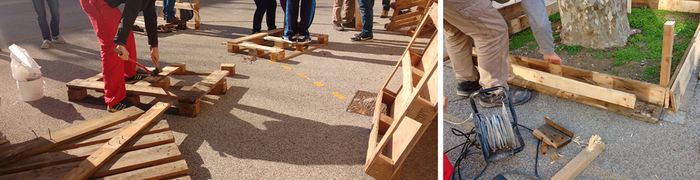 L’action menée ce jour consistait à recycler un tas de palettes pour en faire une jardinière prête à accueillir les plantations de la prochaine opération. Trois heures durant, les participants ont arraché des clous dans ces palettes pendant qu’une autre équipe commençait à assembler les planches récupérées pour les monter en jardinière autour d’un platane.