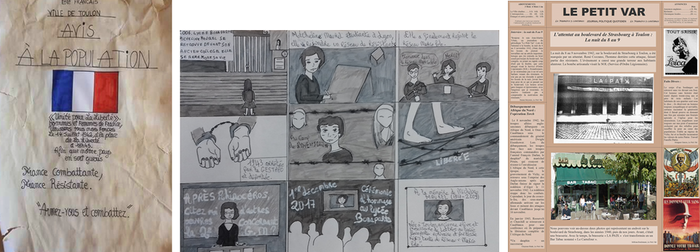 Les élèves ont bénéficié d'ateliers animés par l'Association Equinoxe, de décembre à mars, afin de les aider à réaliser leurs productions plastiques (affiches, tracts, dessins, bandes dessinées...).