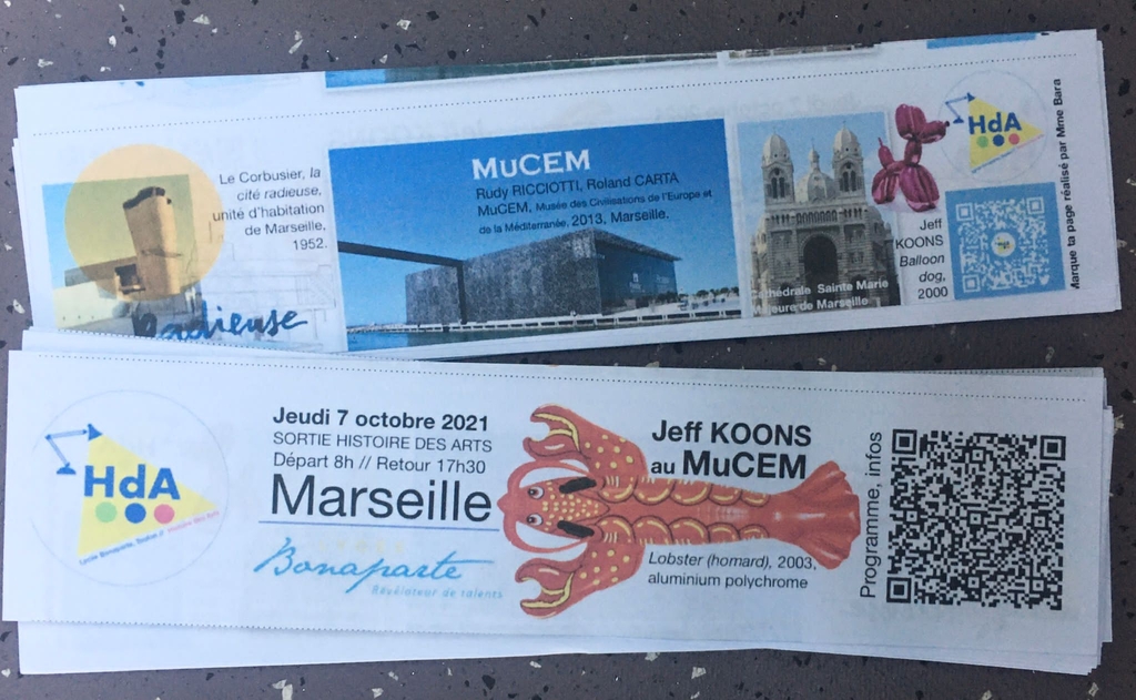Le jeudi 7 octobre 2021, les élèves d’histoire des arts sont partis en sortie à Marseille avec leurs professeures, Mesdames Alimi, Bara, Ninu et Tedeschi. Ils ont pu arpenter la Cité radieuse, construction avant-gardiste des années 50, rebaptisée « la Maison du fada » par les Marseillais, puis ils ont exploré le MUCEM et son magnifique toit-terrasse après avoir suivi une visite guidée de l’exposition du fantasque Jeff Koons, star mondiale du pop art, qui a trouvé sa place au milieu des objets de tradition populaire du MUCEM.