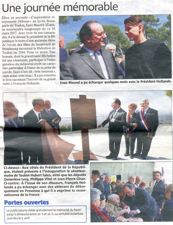 Inauguration Mémorial du Mont Faron : article de Var Matin