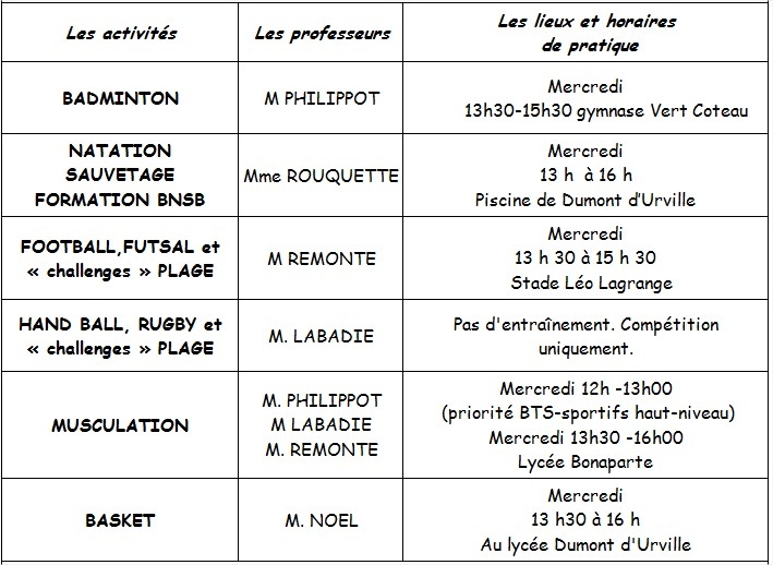 - Autres activités individuelles : pas d'entraînements encadrés mais inscriptions possibles aux compétitions par les professeurs d'EPS (prise de licence obligatoire).